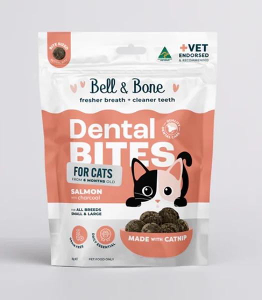 Bell & Bone Cat Dental Bites, made with Salmon and Charcoal, are the ultimate solution for your cat’s dental health. With 40% meat-first ingredient, these bites soften plaque and stop new buildup, thanks to Ascophyllum Nodosum and Cellulose. The active ingredients like Zinc and Vitamin C. Vet-recommended, grain-free, and low-calorie, they promote healthy teeth and gums while being a delicious, nutritious treat.