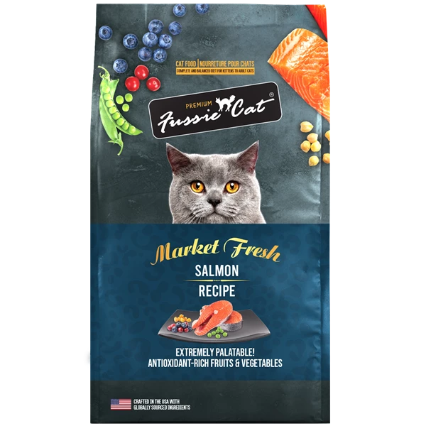 Our Market Fresh recipes are created with the freshest and finest ingredients. Like Salmon, which provides a complete, high-quality protein that’s an excellent source of Vitamin B12 and both Omega-3 and Omega-6 Fatty Acids. Not only is it the first ingredient in Market Fresh recipe, it’s also one of the most palatable foods available for felines.