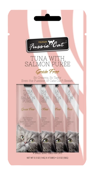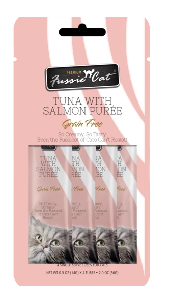 Creamy in texture and rich in taste, this indulgent, flavorsome puree will make even the Fussiest of Cats demand more! is an easy-to-feed cat treat with essential vitamin E for your cat’s diet to support healthy skin and coat.Fussie Cat’s secret to a purr-fect purée is that we always use carefully sourced, simple, and wholesome ingredients. Not only delicious but also full of nutritious vitamins and minerals, each recipe is made without grains, artificial preservatives, or colors, making it an ideal addition to your cat’s everyday diet. Available in eight tasty varieties, Fussie Cat Purées are high in the moisture your feline friend needs for a healthy and active life. Add it as a topper to make mealtime exciting and flavorful, or serve it straight out of the tube as a delicious paw-some snack.