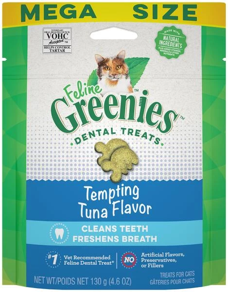 Oral health issues are the most common health problems diagnosed in adult pets.** FELINE GREENIES™ Dental Treats have a specially formulated crunchy texture designed to reduce tartar buildup. Plus, with an irresistible taste, they are sure to stir up purrs of joy. These treats are nutritionally complete and balanced for adult cats, and at less than 2 calories per treat, they’re designed for daily treating. Cat dental care has never been easier — or more delicious. Treat your cat to clean teeth and fresh breath!