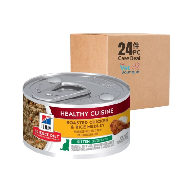 Hill's® Science Diet® Kitten Healthy Cuisine Roasted Chicken & Rice Medley combines the delicious flavors of roasted chicken and rice in a mouthwatering sauce --- canned cat food with the perfect balance of taste and nutrition for your cat.