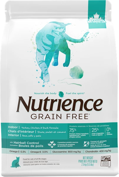 A lower-fat formulation for cats of all life stages and all breeds, Nutrience Grain Free Indoor Cat – Turkey, Chicken & Duck formula especially suits indoor cats and less active cats still requiring a grain-free diet.