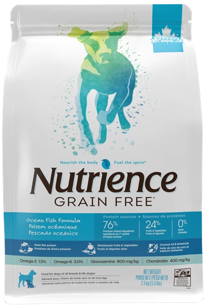 For pets sensitive to poultry and other land-based proteins, Nutrience Grain Free Ocean Fish dog food provides a delicious grain- and gluten-free alternative for all life stages. Made in Canada with fresh never frozen animal ingredients, Nutrience Grain Free closely mimics a carnivore’s ancestral diet. Multiple sources of wild-caught Pacific fish are combined with healthy fats, fruits, vegetables and botanicals while grains are replaced with low glycemic sweet potatoes and lentils*. It’s an excellent choice for pets with a particularly active lifestyle or for pet parents who simply prefer to feed their pets a grain free diet.