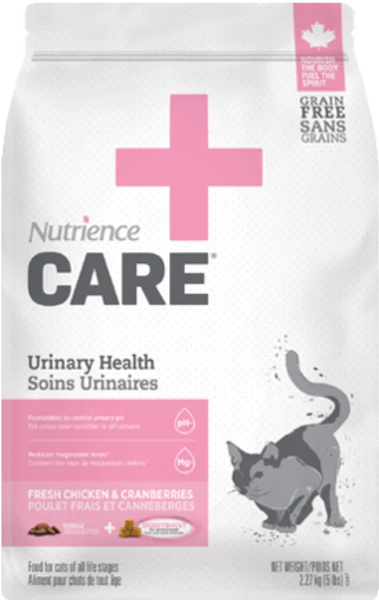 Nutrience Care® Urinary Health food for cats is a complete and balanced diet precisely formulated to help maintain a healthy urinary tract. A combination of fresh chicken, cranberries, plant-based proteins and meticulously controlled mineral levels are used to create a diet designed to control urinary pH in order to create an unfavourable environment for crystal formation. In addition to caring for your cat’s special needs, we’ve taken great strides to ensure their care is delivered in the form of high quality, gluten-free kibble, made of healthy, wholesome ingredients. Additionally, the magnesium levels in this food are 20% lower than our regular Grain Free Ocean Fish recipe to help decrease the likelihood of struvite crystal formation.