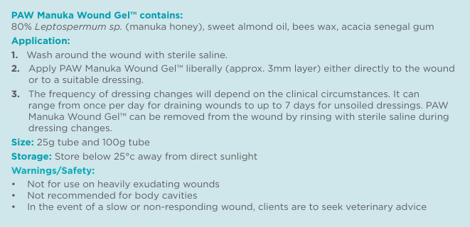 PAW Manuka Wound Gel™ is a sterile, medical grade wound dressing composed of 80% manuka honey (Leptospermum sp.) combined with natural oils and