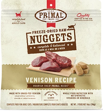It’s easy to feed your cat real, whole foods that deliver optimal nutrition and digestibility with Primal Freeze-Dried Raw Nuggets. Our Venison Recipe freeze-dried raw cat food is free of synthetic vitamins and minerals. It’s made with grass-fed venison raised without antibiotics, steroids, or added hormones and organic produce. Simply portion, shred, and hydrate with warm water, Bone Broth, or Raw Goat Milk.
