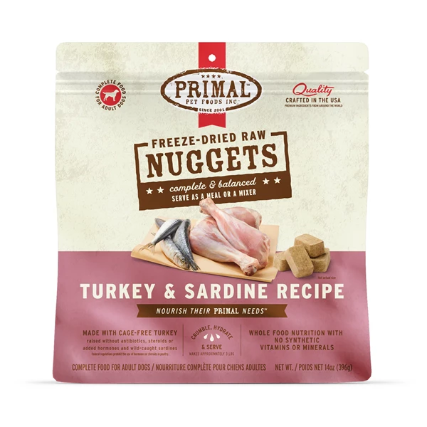 It’s easy to feed your dog real, whole foods that deliver optimal nutrition and digestibility with Primal Freeze-Dried Raw Nuggets. Our Turkey & Sardine Recipe freeze-dried raw dog food is free of synthetic vitamins or minerals and is made with cage-free turkey raised without antibiotics, steroids, or added hormones and wild-caught sardines. Simply portion, shred, and hydrate with warm water, Bone Broth, or Raw Goat Milk.