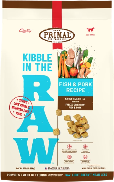 Kibble in the Raw reimagines “kibble” the Primal way so you can nourish your dog’s Primal needs. Our Fish & Pork Recipe raw dog food is crafted with wild-caught fish and crate-free pork raised without antibiotics, steroids, or added hormones. It also features other thoughtfully selected, premium, and raw ingredients. Kibble in the Raw delivers optimized nutrition and digestibility in the same scoop-and-serve feeding experience as kibble.