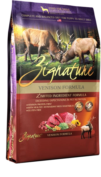 Fill your best friend’s bowl with wholesome nutrition when you feed them Zignature Venison Limited Ingredient Formula Grain-Free Dry Dog Food. Your pup will enjoy a delicious dinner made with real Venison from New Zealand, wholesome peas, chickpeas, and flaxseed. This meat-first recipe offers pups the protein they need to thrive, while Zignature’s limited ingredient recipe throws out troublesome ingredients like chicken, corn, wheat, soy, and potatoes, creating peak hypoallergenic, low-glycemic nutrition. Combine that with key antioxidants, essential fatty acids, and a complete spectrum of vitamins and minerals for a well-rounded meal that goes beyond nature to become your pet’s signature food for life.
