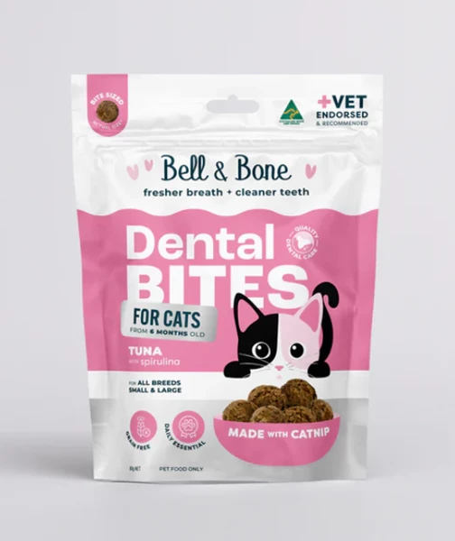 支持貓咪的口腔健康,使用 Bell & Bone 的吞拿魚與螺旋藻潔齒粒。這些潔齒粒含有40%的肉類,並富含鋅、維生素C和海藻等強效成分,以對抗牙菌斑。咀嚼的質地幫助刮去牙石,是每日牙齒護理的完美解決方案。經獸醫推薦,無穀物且低脂,這些潔齒粒能保持貓咪的牙齒潔淨健康。
