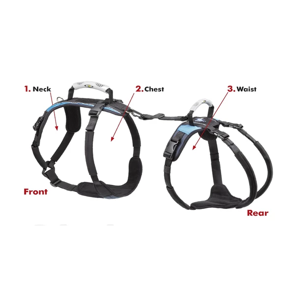 我們的所有安全帶都從包裝袋中完全裝好,這意味著前後髖關節提升器已連接。在拆解之前,請注意其組裝方式。它具有11個單獨的調整和9個單獨的連接器夾。請按原樣在您的幼犬上嘗試一下,然後進行調整。