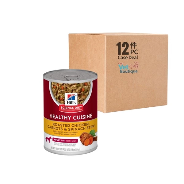 希爾思™寵物食品 成犬 Healthy Cuisine 健康燉肉罐罐 香烤雞肉燉胡蘿蔔及菠菜罐頭,結合香烤雞肉和軟嫩蔬菜,提供可口多汁的燉菜,達到美味與營養間的完美平衡,適合您愛犬的罐裝食品。