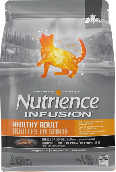 Nutrience Infusion 健康成貓糧是在加拿大製造,結合了新鮮(從未冷凍過)的雞肉、低升糖的全穀類、蔬菜、水果和富含營養的植物成分。