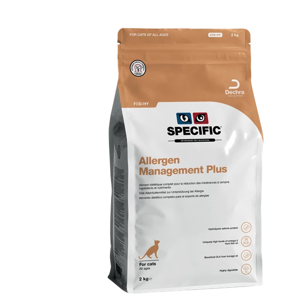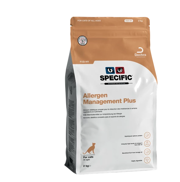 SPECIFIC™ 過敏管理加旨在幫助有多重過敏的貓咪。精心挑選的成分降低了食物過敏的風險,同時支持皮膚的營養成分有助於加強皮膚,從而改善對外部過敏原的屏障保護。透過高水平的 Omega-3 魚油來緩解過敏症狀,支持自然的抗炎過程。