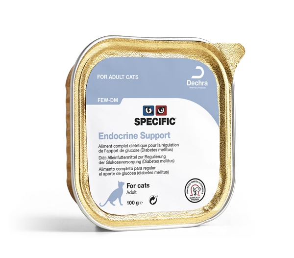 SPECIFIC™ 內分泌支持貓糧是一款濕食,專為患有糖尿病及其他內分泌疾病(如甲狀腺功能低下和庫欣症)提供營養支持。該飲食具有低碳水化合物水平和低升糖指數的碳水化合物來源,富含纖維和Omega-3魚油,有助於支持血糖控制並提供全面健康支持。