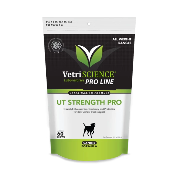 VETRISCIENCE UT Strength PRO 犬用尿道保健咀嚼片是一種支持狗狗尿道健康的配方。這款狗泌尿保健咀嚼片可以長期用於容易出現泌尿道問題或結晶的狗隻。 VETRISCIENCE UT Strength PRO 含有 D-甘露糖,這是一種天然單醣,有助於消除有害細菌。此外,還含有 N-乙酰氨基葡萄糖 (NAG),這是生成糖蛋白的重要成分。泌尿道粘膜內層的糖蛋白層富含 NAG,作為抵禦酸和細菌的保護屏障。GanedenBC30® 是一種專利益生菌,經 17 項臨床研究支持,有助於維持泌尿道微生物群的平衡。